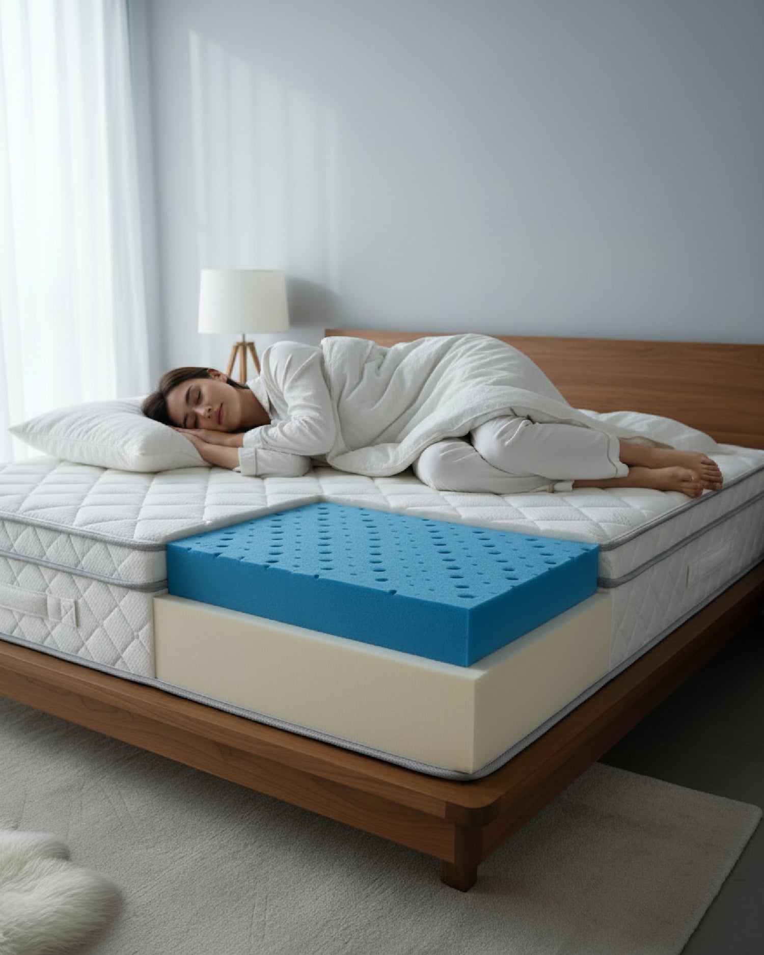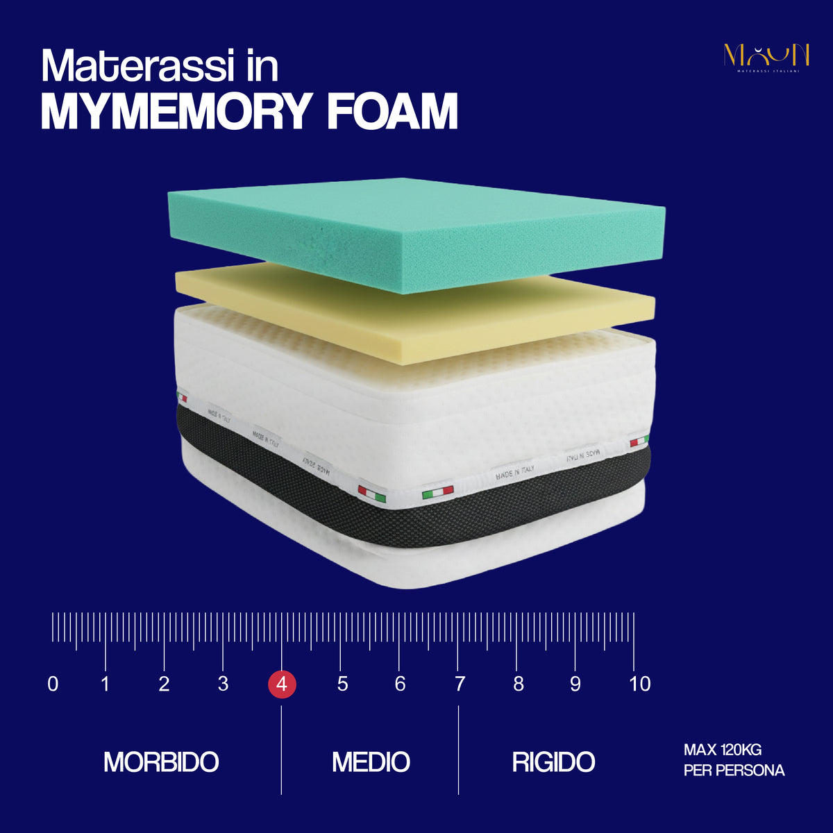 Strati di memory foam ad alta densità abbinati a una base in schiuma poliuretanica portante, progettata per mantenere stabilità e supporto nel tempo.