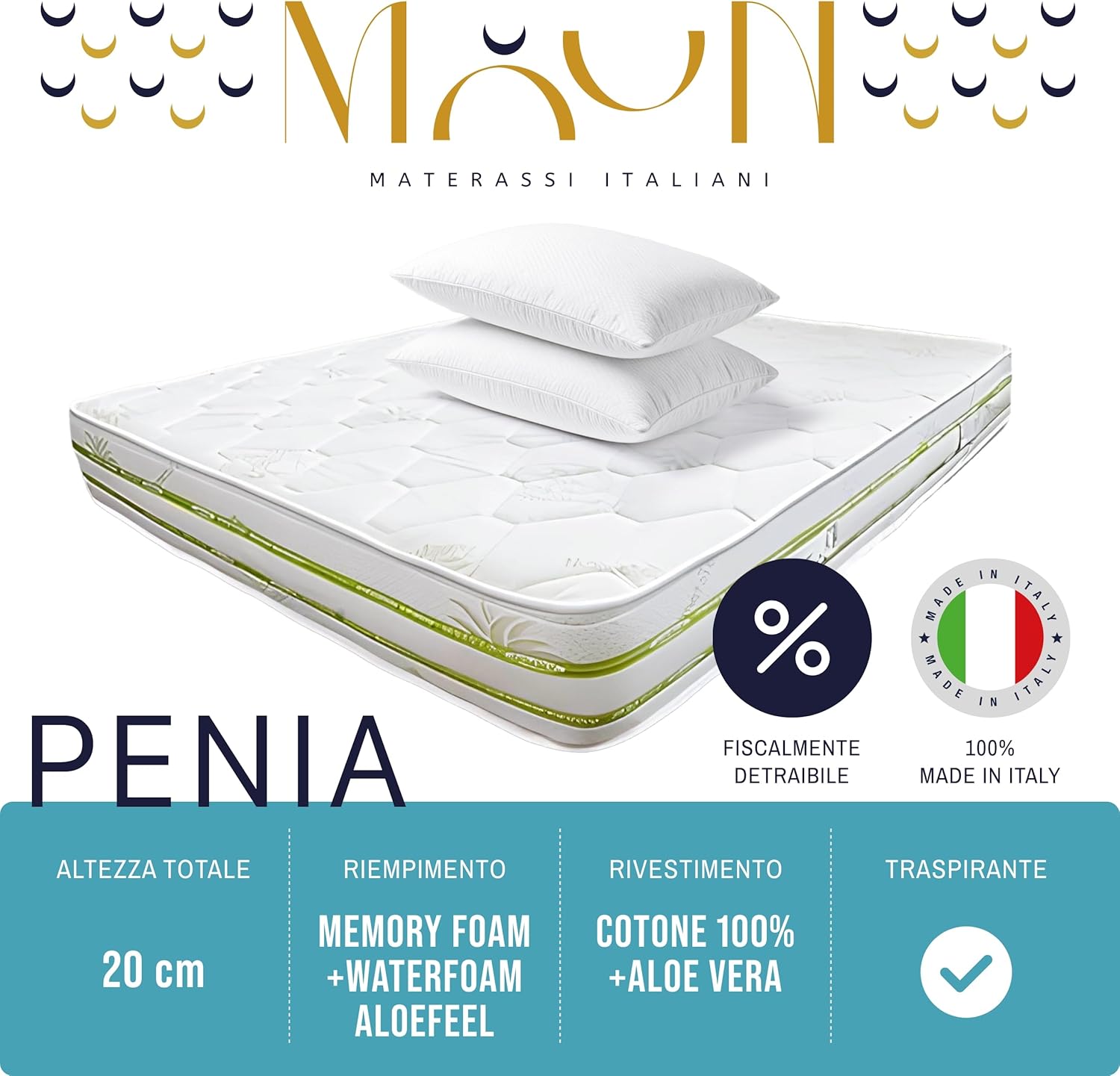 Il Marchio Italiano di Qualità: I materassi MUUN portano con orgoglio il marchio "Made in Italy", sinonimo di qualità, bellezza e affidabilità. Quando si acquista un materasso MUUN, si sta investendo in un prodotto che rappresenta il meglio dell'artigianato italiano.In breve, i materassi MUUN sono molto più di semplici prodotti per il sonno; sono un tributo all'eccellenza artigianale italiana. Ogni notte passata su un materasso MUUN è un omaggio alla tradizione artigiana e all'innovazione senza compromessi.